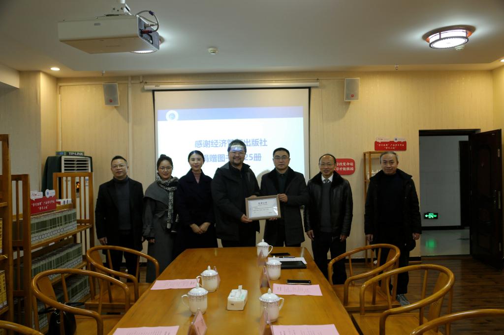 1月15日,经济管理出版社向我校捐赠图书仪式在图书馆举行。经济管理出版社经世分社社长曹靖,民建广安市委会秘书长谭钠,学校党委委员、统战部长、工会主席杨建华,党委委员、组织部长白文春参加揭牌仪式,学校图书馆、档案馆馆长龙治勇主持仪式。