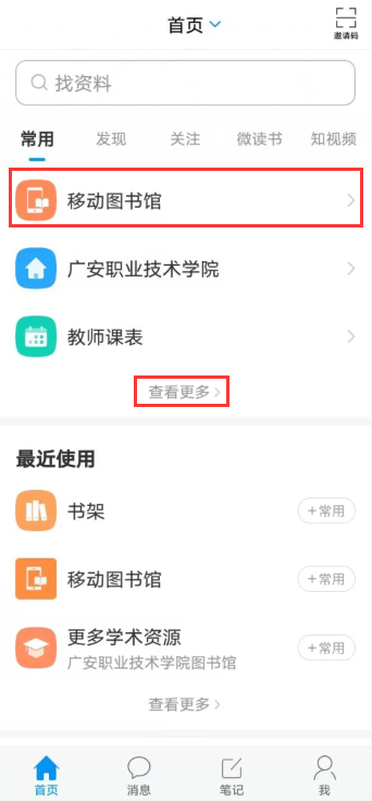 使用说明:在APP主界面点击“移动图书馆”(如未找到,请点击“查看更多”),初次进入移动图书馆会要求绑定借阅证,借阅证号和密码与检索平台相同。进入移动图书馆后,可通过“馆藏查询”检索馆藏文献资源,查询图书在馆情况;通过“借阅记录”查询个人当前借书情况并进行自助续借。此外在学习通主界面输入邀请码“gazytsg”可参加图书馆的阅读推广活动。