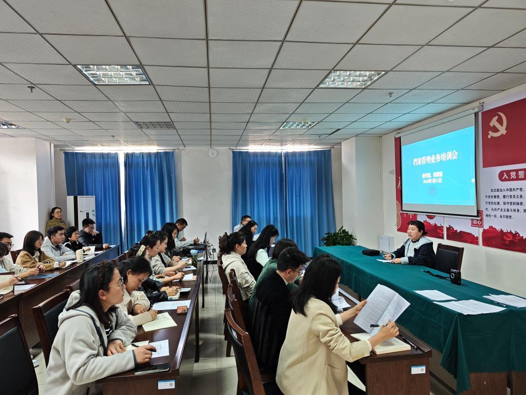会议开始,图书馆、档案馆副馆长唐安婷通报了学校2025年档案工作情况,强调了档案收集、整理和归档的重要性。